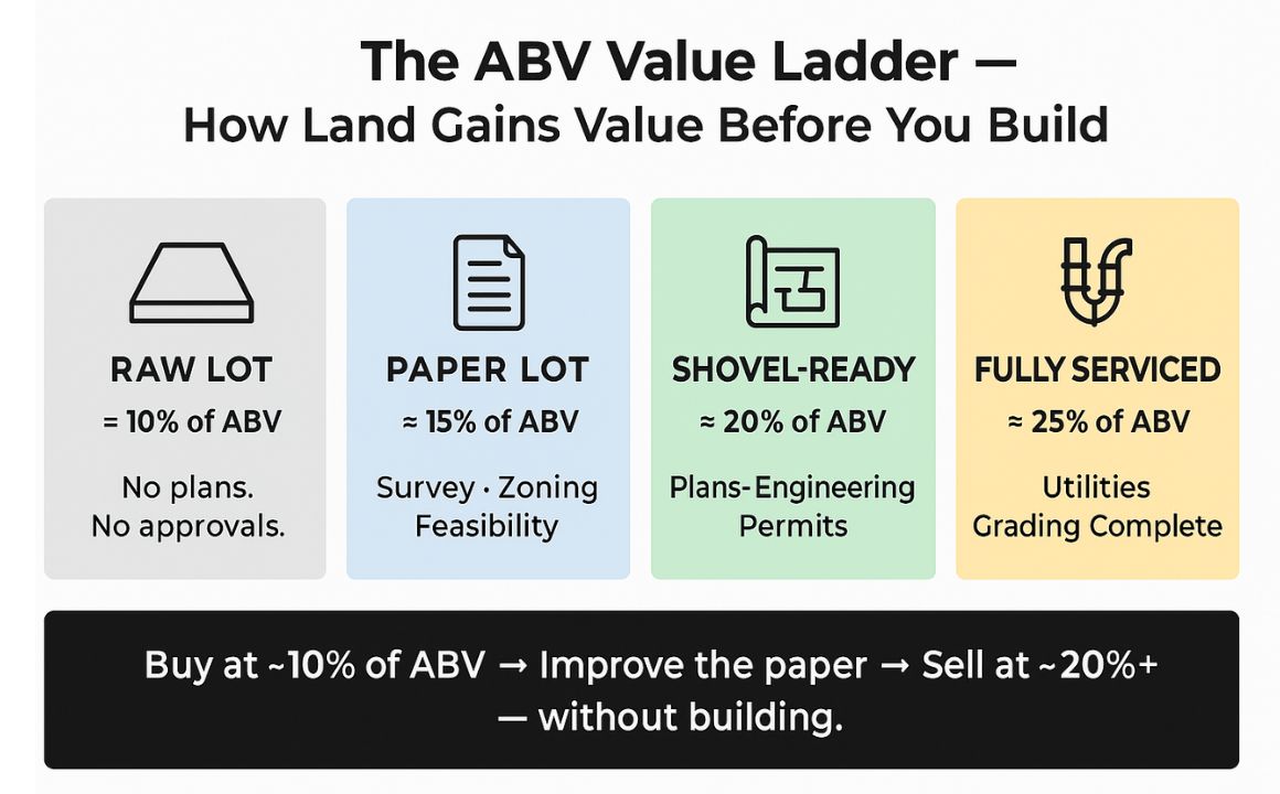If you’re new to development, here’s the simple rule that ties everything together. This ABV Value Ladder shows how land typically moves from about 10% to 25% of the After-Build Value before a single wall goes up—and where YOU capture the profit in the middle.